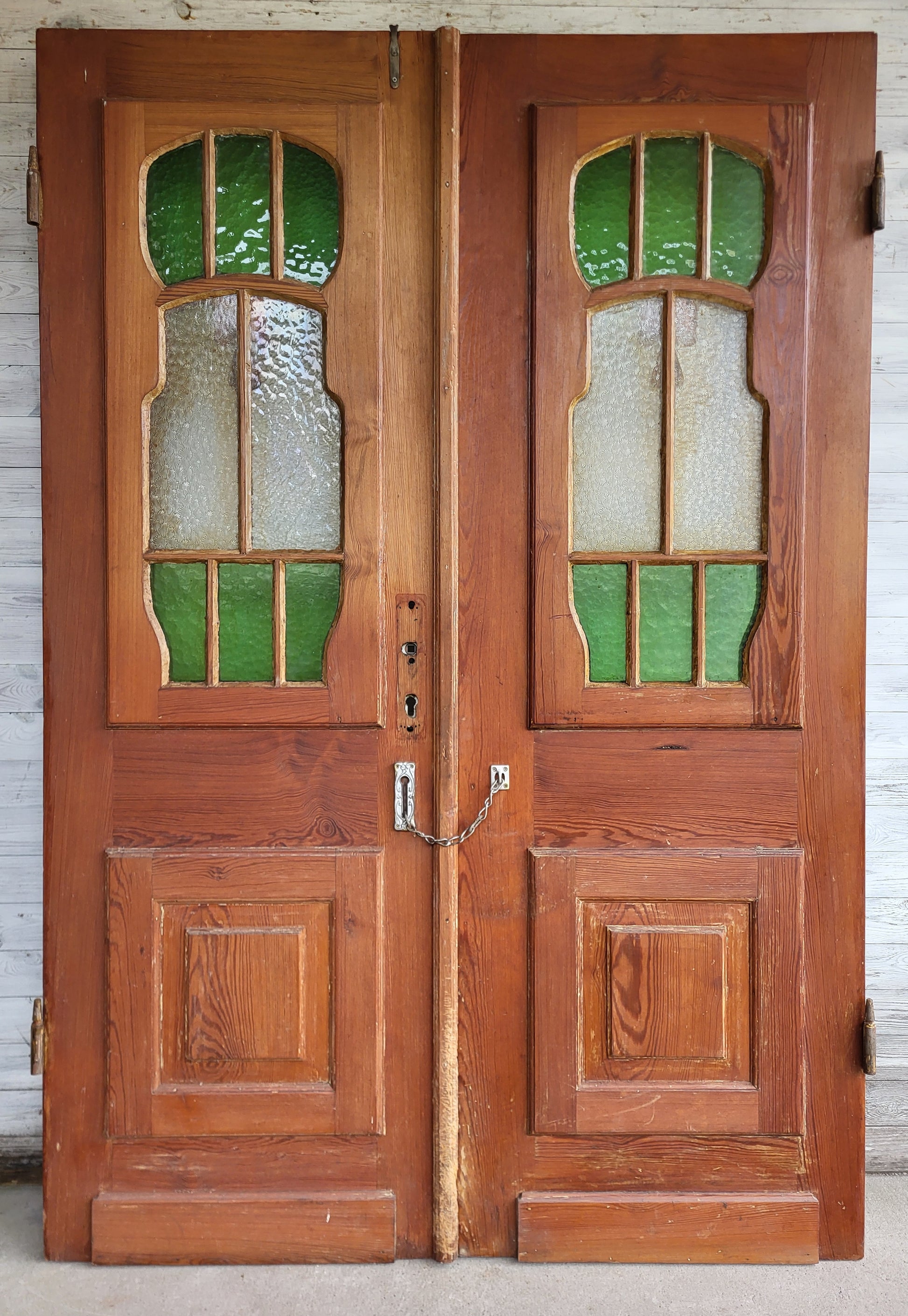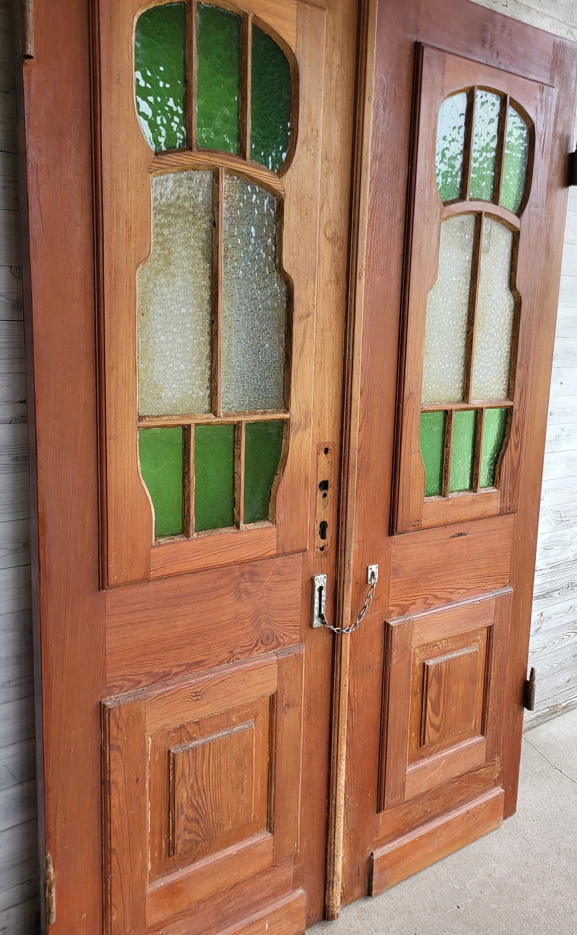 -sehr kräftige Türflügel, in einem sehr guten Zustand, orig. Verglasung ohne Schäden (1St. Scheibe nicht orig.), orig. innenliegende Feststellriegel, Türbänder komplett