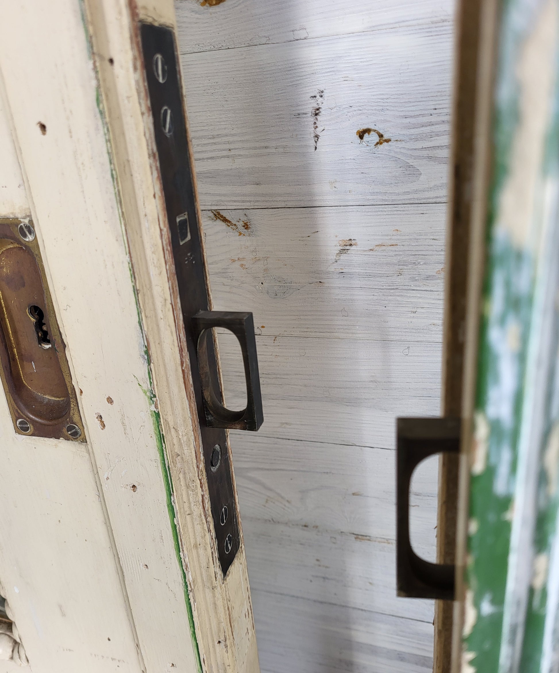 - in einem, dem Alter entsprechend, sehr guten Zustand, orig. Facettenglas ohne Schäden, orig. Griffmuscheln, orig. funktionale Einsteckschlösser in Messing, kein Schienensystem vorhanden