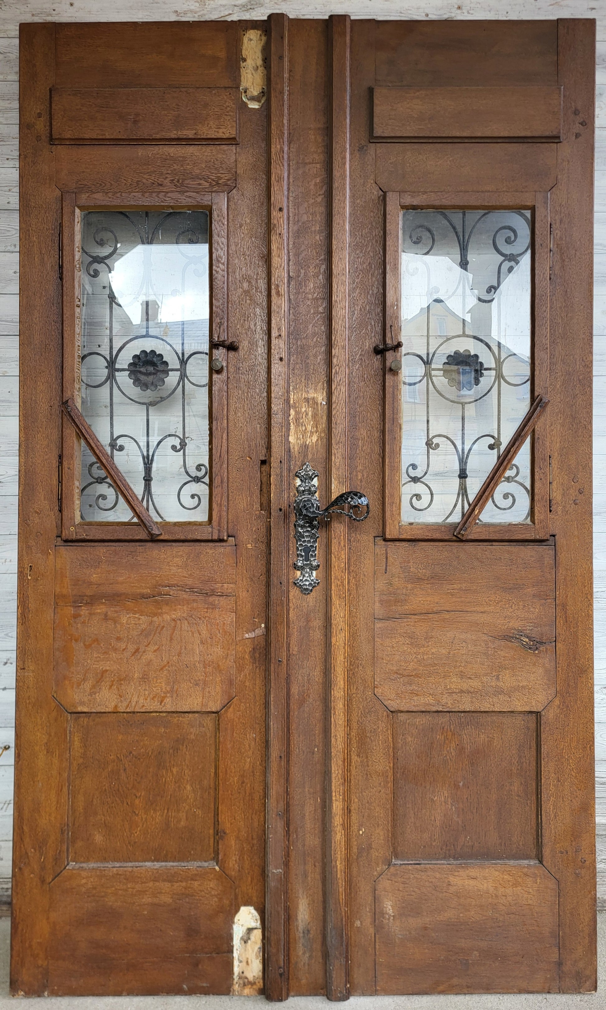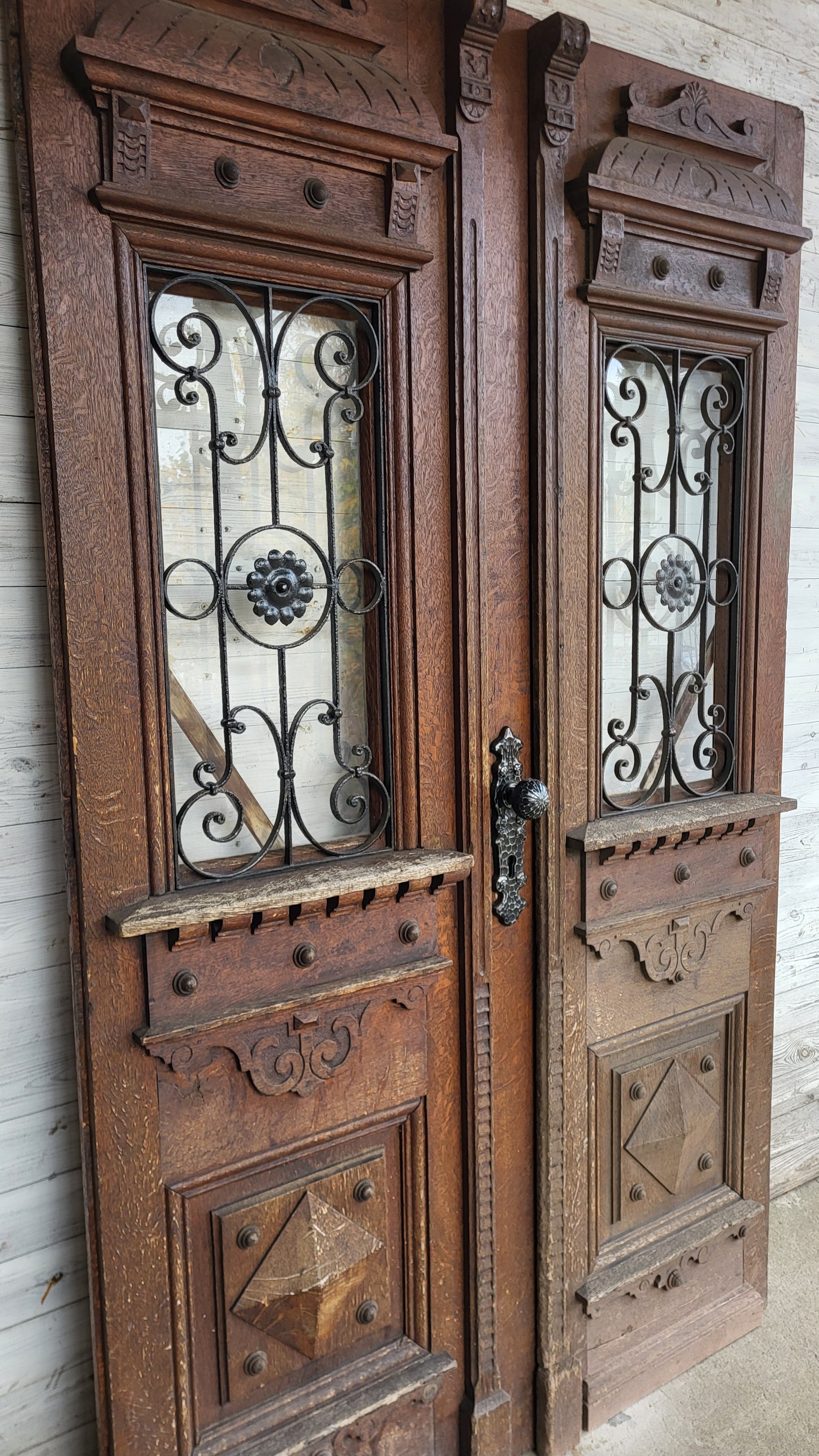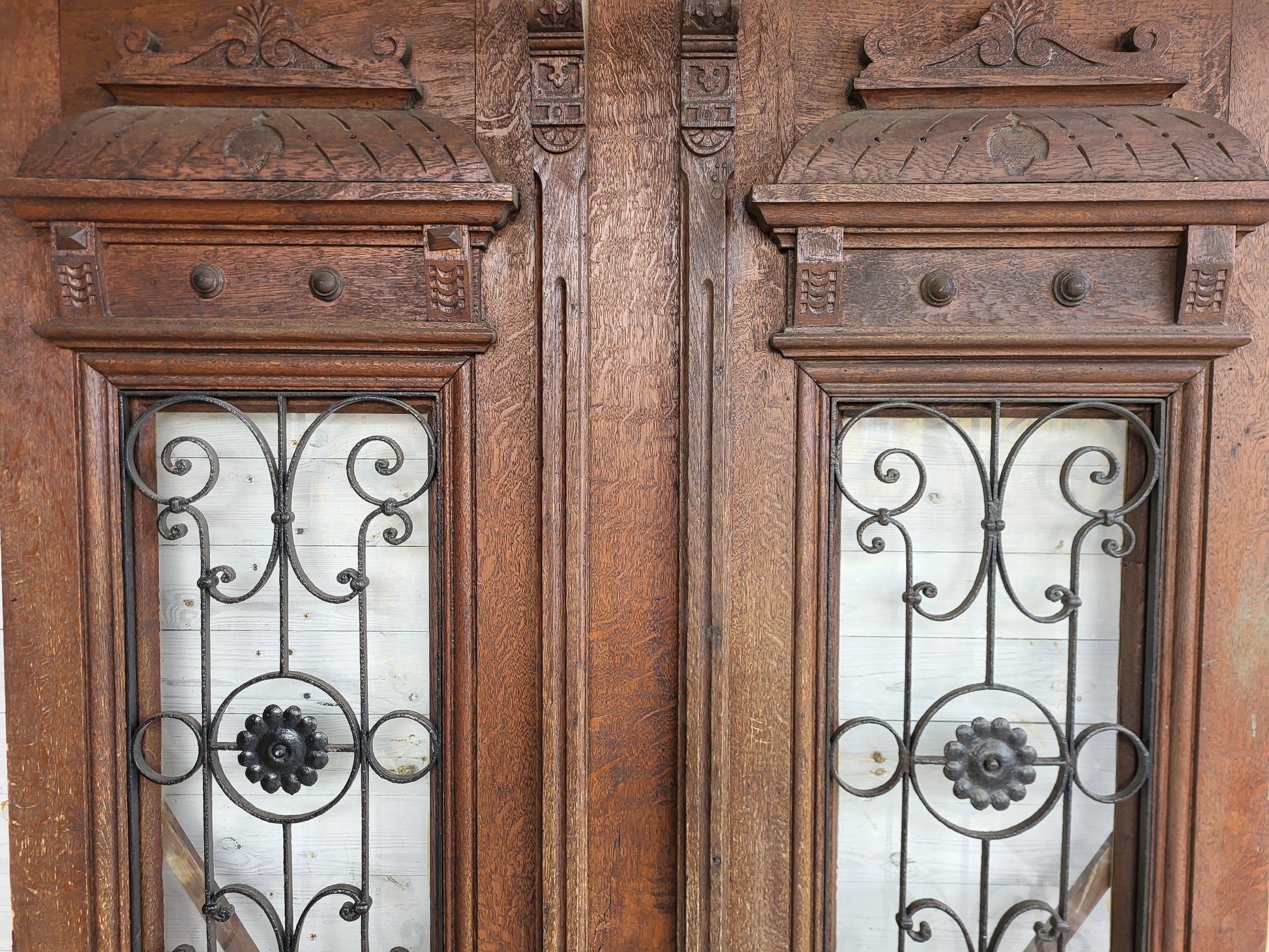 -filigrane Eingangstür, insgesamt guter Zustand, Holzzierteile vollständig erhalten, deko. Fenstergitter, Fenster rückseitig zu öffnen, orig. Türbänder nicht vorh. (Ersatz vorrätig), Seitenflügel ohne Feststellriegel, in Höhe Türschloss restaurierungsbedürftig
