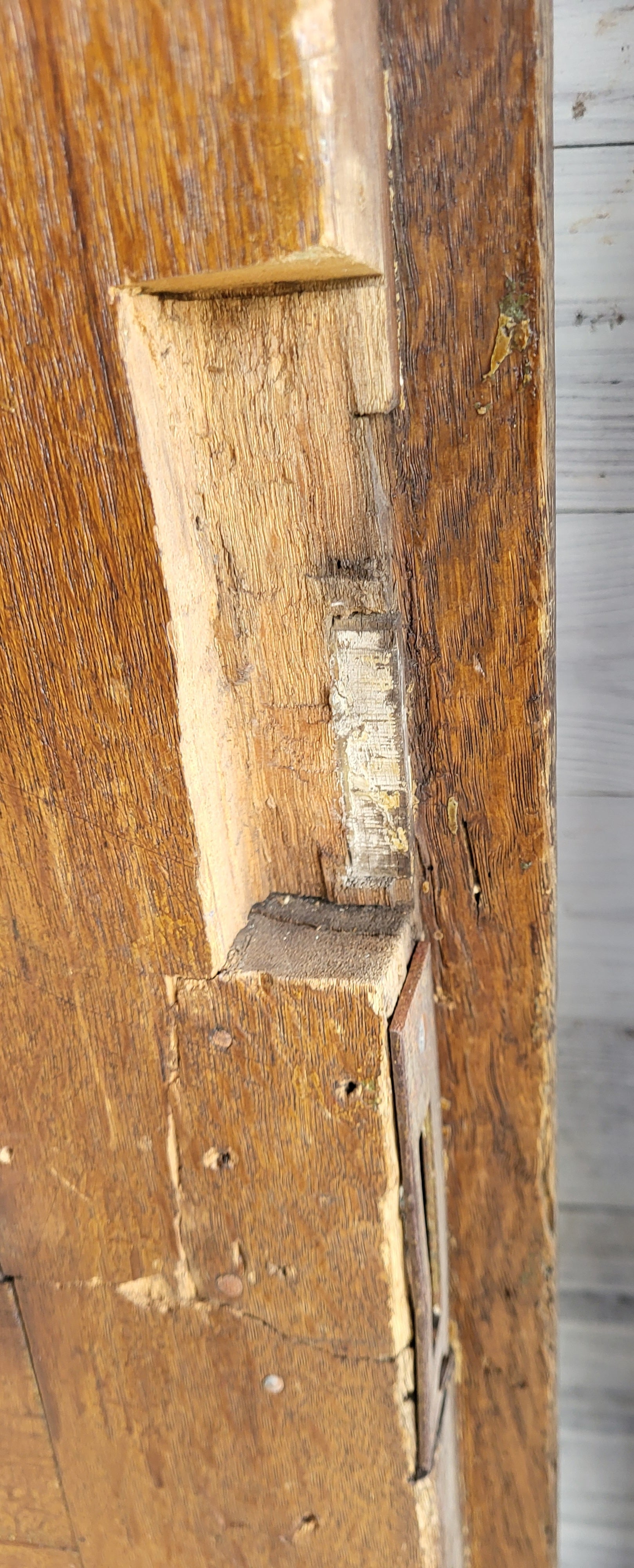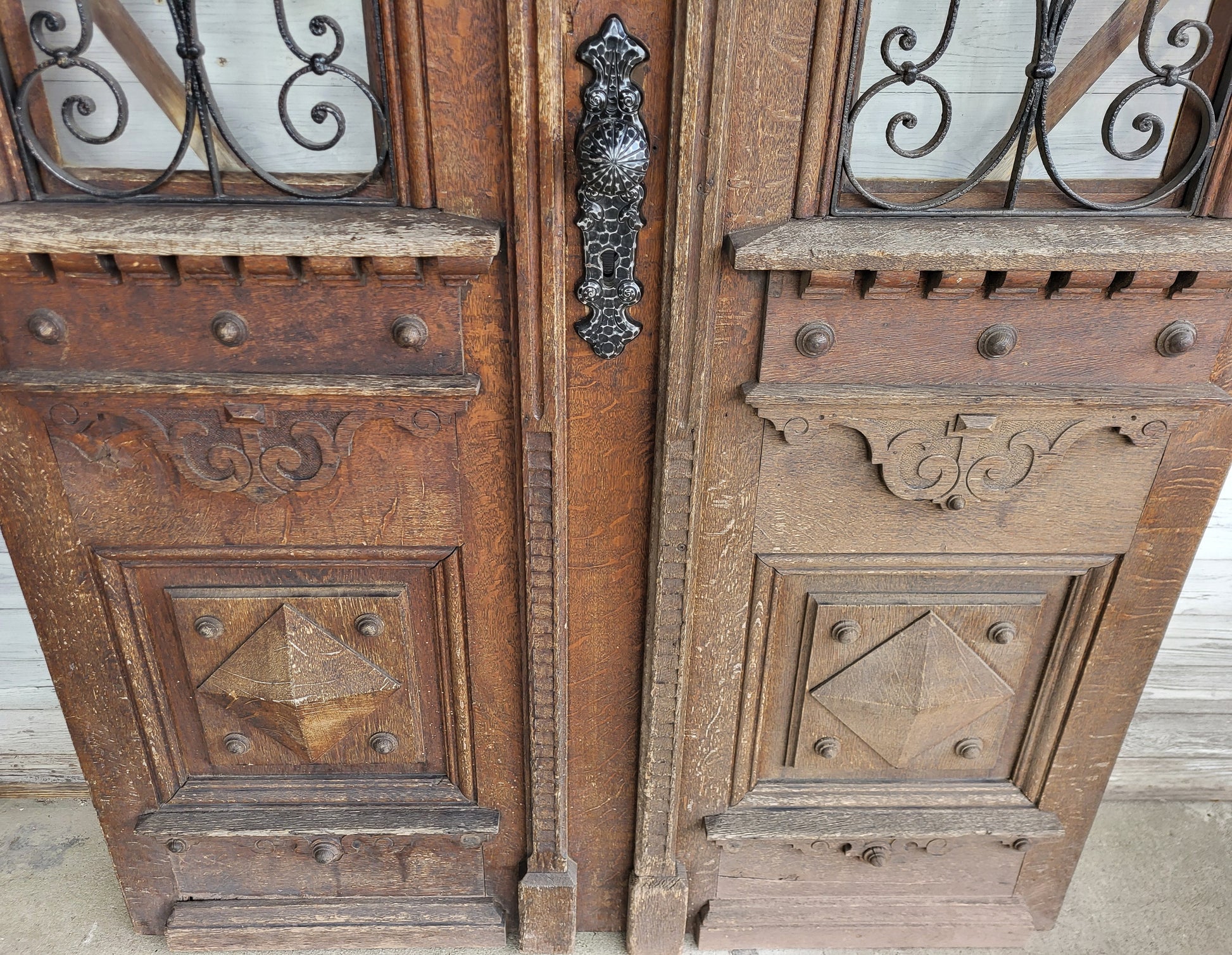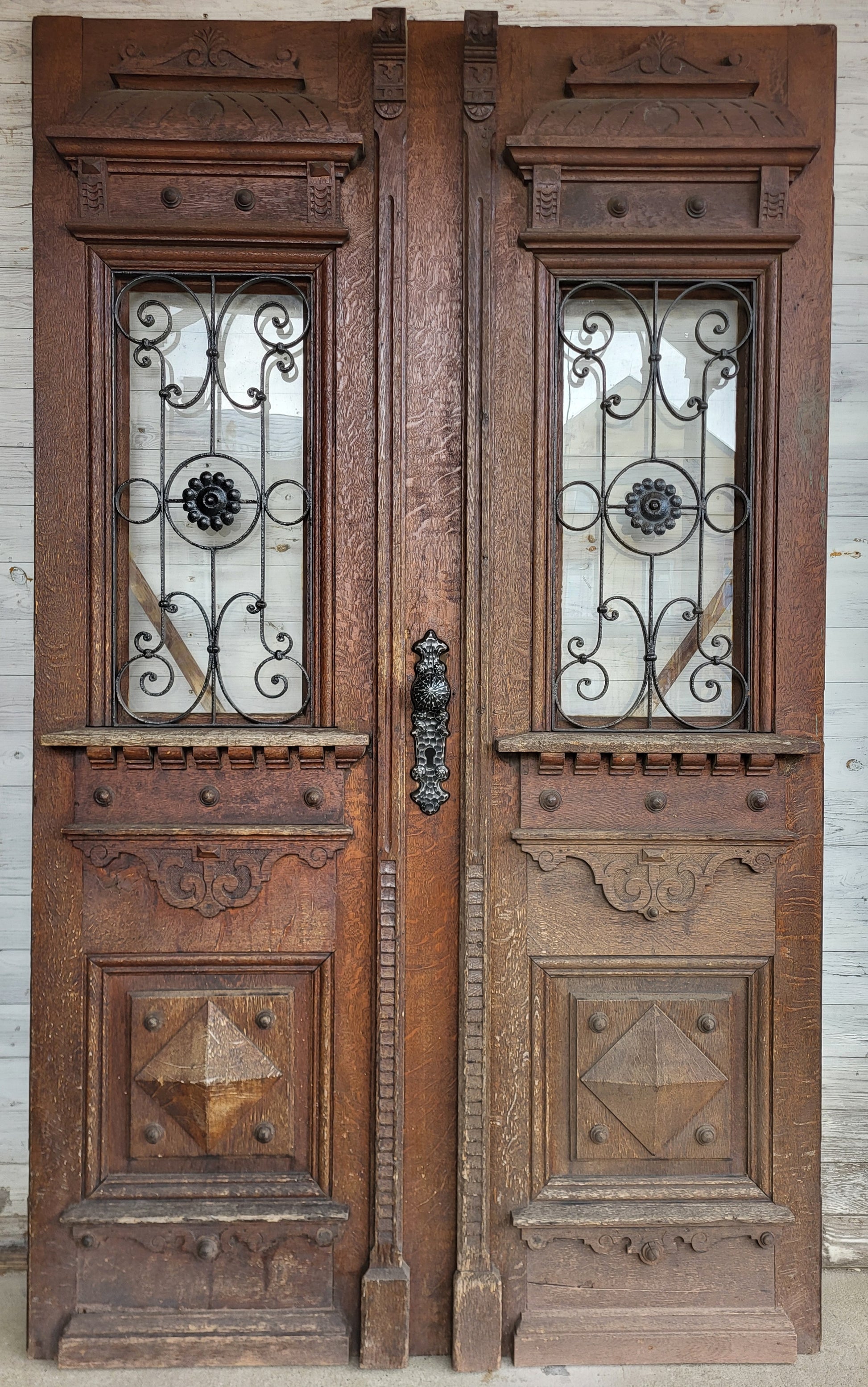 -filigrane Eingangstür, insgesamt guter Zustand, Holzzierteile vollständig erhalten, deko. Fenstergitter, Fenster rückseitig zu öffnen, orig. Türbänder nicht vorh. (Ersatz vorrätig), Seitenflügel ohne Feststellriegel, in Höhe Türschloss restaurierungsbedürftig