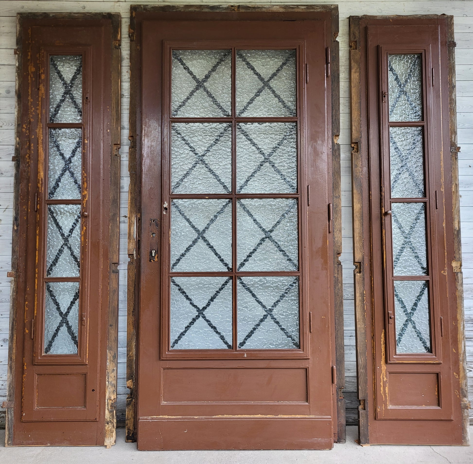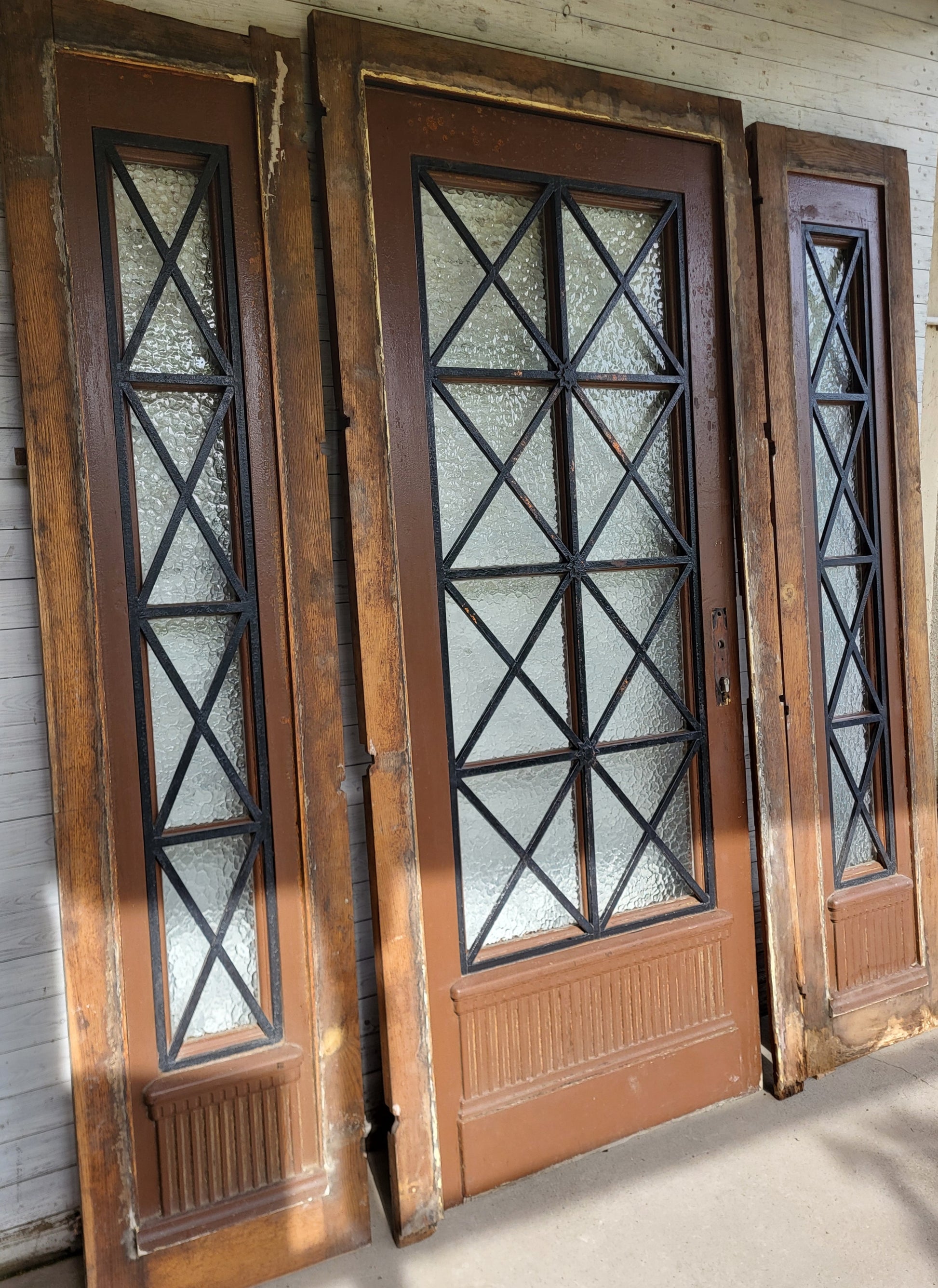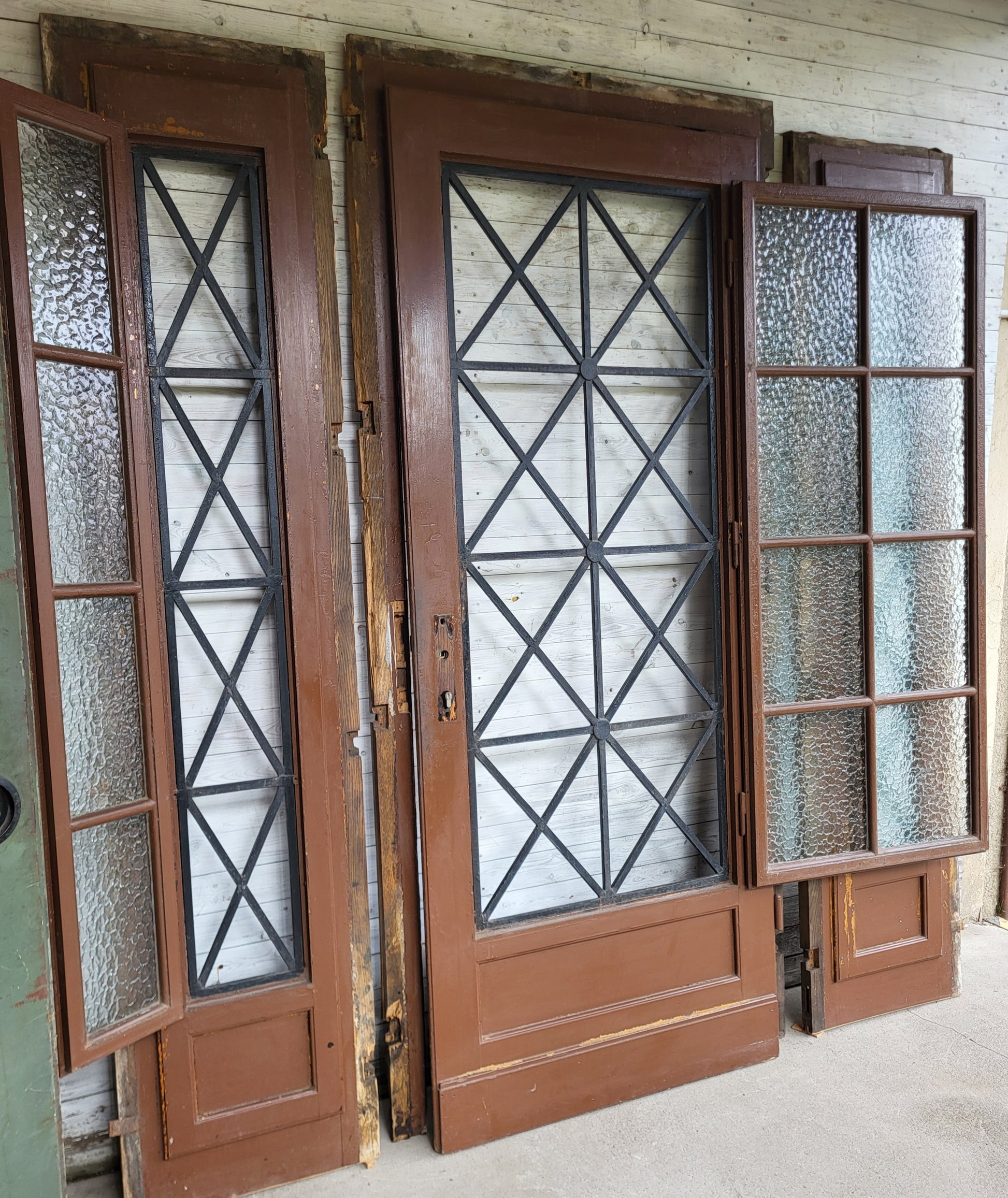 - 1- Flgl. Haustür mit jeweils separat feststehendem Seitenteil links und rechts, bei allen 3 Elementen rückseitig massive Vergitterung und Fenster zu öffnen, Verglasung neu und ohne Schäden, alles äußerst massiv und in einem hervorragendem Zustand